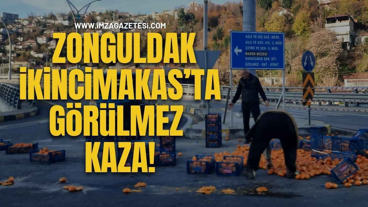 Zonguldak’ın en yoğun geçiş noktalarından biri olan İkinci Makas kavşağında, virajı alamayan bir meyve yüklü aracın kasaları yola devrildi. Kazanın ardından yüzlerce kilo mandalina asfalt üzerine saçılırken, yol bir süreliğine araç trafiğine kapandı.