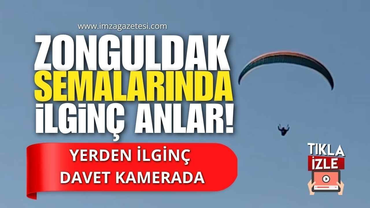 Zonguldak’ın Kilimli ilçesinde gökyüzünde uçuş yapan yamaç paraşütü sporcusunu fark eden bir vatandaş, yerden seslenerek paraşütçüyü çay içmeye davet etti. Beklenmedik bu çağrı karşısında havadaki sporcu da kayıtsız kalmadı.