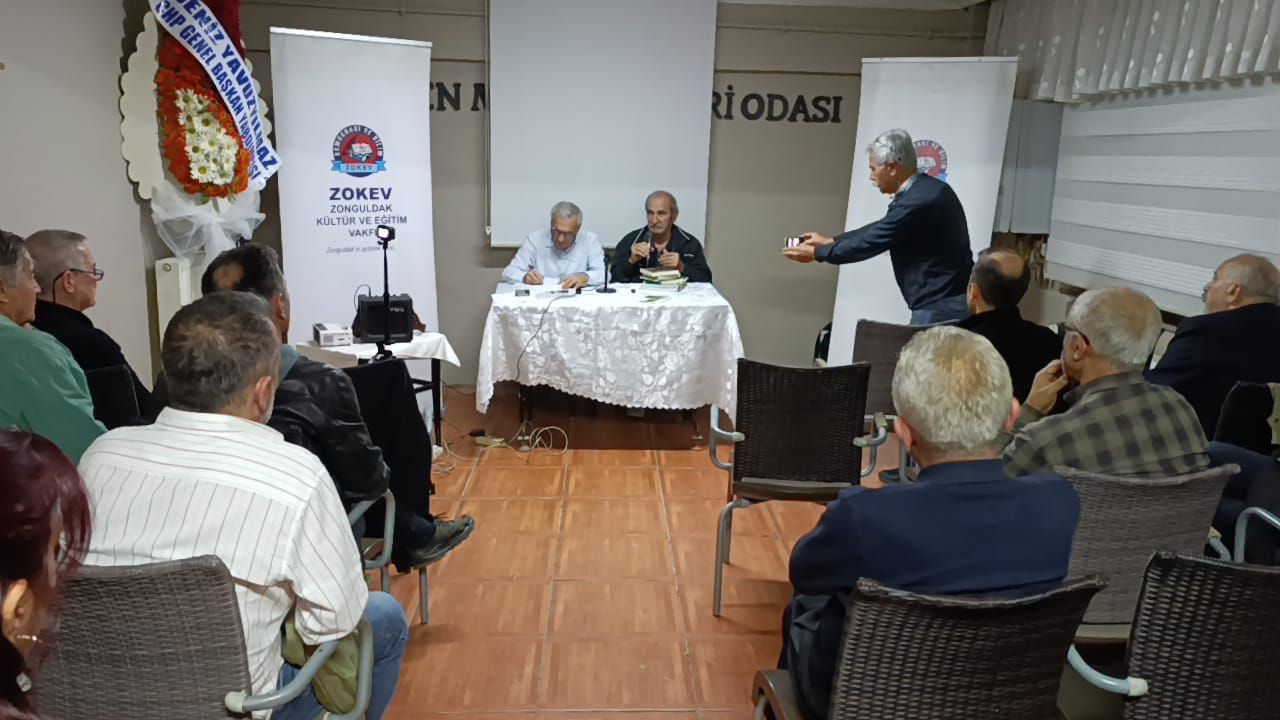 Maden Mühendisleri Odası Lokali’nde düzenlenen söyleşiye Zonguldak’ın önde gelen isimleri ve kent kültürüne ilgi duyanlar katıldı. Etkinlikte Maden Mühendisleri Odası Başkanı Erdoğan Kaymakçı, Tüm Emeklilerin Sendikası Zonguldak Şube Başkanı Mahmut Kılıç, Sol Parti İl Başkanı İsmail Yıldız, belediye ve Kültür Merkezi Müdürü Kürşat Coşkun, Çaycumalar Derneği Başkanı Savaş Çiloğlu, ZOKEV Başkanı Üzeyir Karahasanoğlu, Karaelmas Gazeteciler Derneği Başkanı Bahattin Arı, tiyatro sanatçıları ve çok sayıda sivil toplum kuruluşu temsilcisi hazır bulundu.