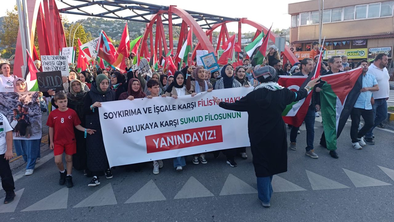 Grup, İstasyon Caddesi'nden başlayarak ellerinde “yaşasın küresel intifada”, “özgür filistin” ve “sumud filosu onurumuzdur” yazılı pankartlarla yürüdü. Yürüyüşte aileler, gençler, bazı sendika temsilcileri ve çok sayıda sivil toplum kuruluşu yer aldı; kortej Madenci Anıtı'nda sona erdi.