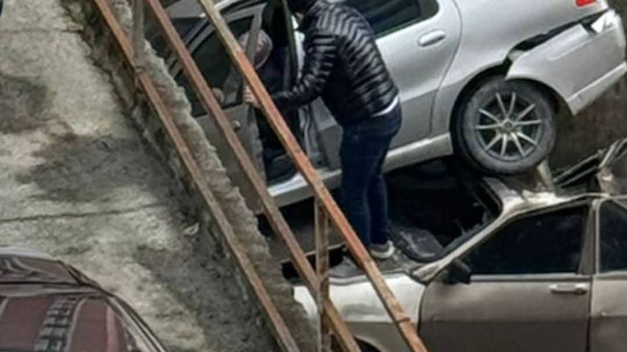 Kadın sürücünün kullandığı araç kaldırımlardaki korkulukları kırarak, park halindeki taksinin üzerine düştü.