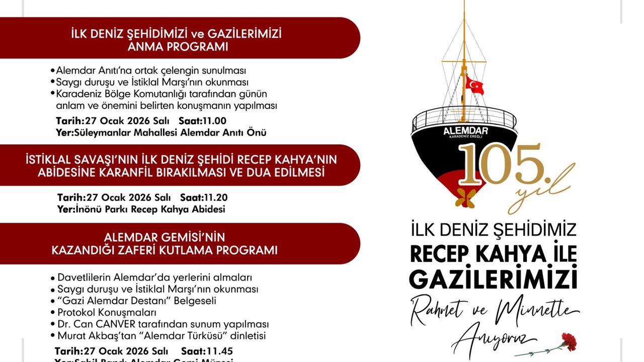 İstiklal Savaşı’nın ilk deniz şehidi Recep Kahya ve kahraman denizciler, 27 Ocak’ta düzenlenecek anlamlı programlarla anılacak. Alemdar Gemisi’nin destansı zaferi ise törenlerle yeniden hatırlatılacak.