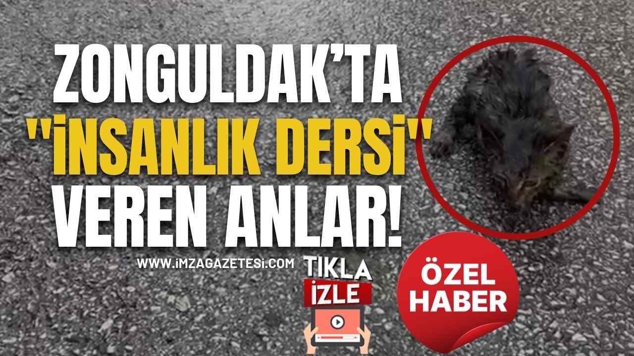 Yağmurda sırılsıklam vaziyette olduğu görülen ve bir bacağının kırık olduğu anlaşılan yavru kedinin sürünerek hayata tutunmaya çalışmasına tanık olanlardan bir kadının deli divane olarak cep telefonuyla Zonguldak Belediyesi’nden tanıdığı birini arayıp yardım istemesi adeta insanlık dersi verdi.