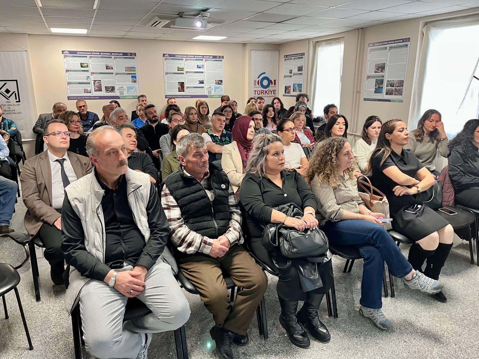 Türkiye Taşkömürü Kurumu (TTK) İş Sağlığı Güvenliği ve Eğitim Daire Başkanı Yaşar Uzunkavaklı Eren, sunumunda, kömürün oluşumu, kullanım alanları, dünyada ve Türkiye’de kömür rezervleri, taş kömürü havzasının tarihi, TTK ve havzada taş kömürü üretimi, TTK havza sınırları, rezerv ve üretim alanları, TTK’nın 1941-2024 üretimleri ve özel sektörün üretim miktarları, sektörel kömür satışları, solunabilir tozla mücadele konuları ile madencilerin deprem bölgelerindeki başarılı çalışmalarına değinerek, kurumlarında solunabilir tozla mücadelenin titizlikle uygulanarak en az ayda bir yapıldığını, taş kömürü rezervinin sadece Zonguldak’ta bulunduğunu, fosil yakıt olsa bile kömürden vazgeçilemeyeceğini, kömürle iç içe durumdaki Zonguldak’ın sanayi devriminin lokomotifi olduğuna dikkati çekti.